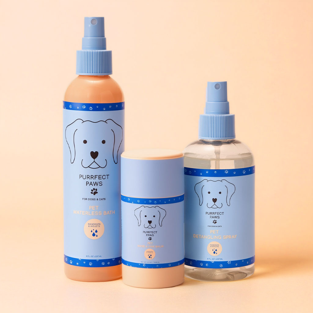 Spray the Waterless Bath directly onto your pet's fur, avoiding the eyes and ears. Use a comb or brush to work the product through the coat, gently removing dirt, moisturizing hair, and leave your pet refreshed—no rinsing required. Follow with the Leave-In Detangler for lightweight conditioning and easy, tangle-free brushing. Use the roll-on Paw Balm daily or as needed to soothe dry, cracked paws and protect them against the elements.